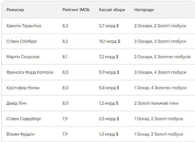 На основі зібраних даних можна зробити висновок, що найкращим режисером є Квентін Тарантіно. Його фільми мають найвищий рейтинг за IMDb, а також здобули значні касові збори та нагороди.