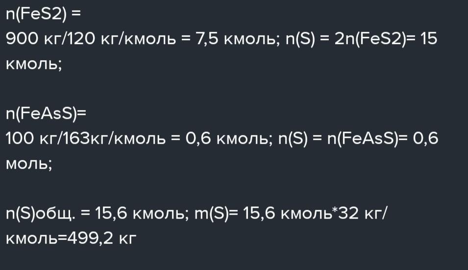 Руда содержит 90% FeS2 и 10% FeAsS. Подсчитайте, сколько килограммов серы содержится в 1 тонне этого минерала.