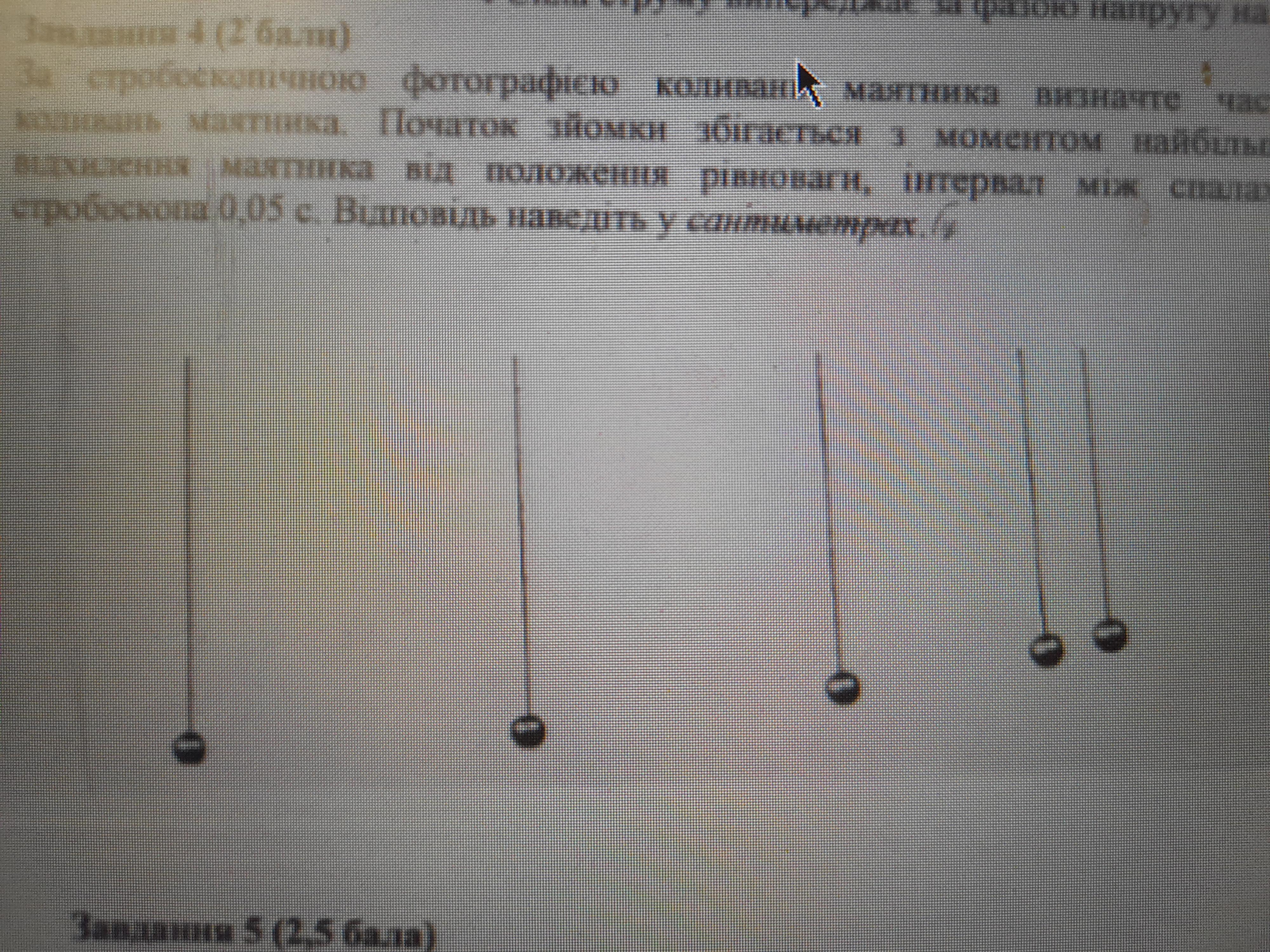 За стробоскопічною фотографією коливань Маятника визначте частоту коливань маятника. Початок зйомки збігається з моментом найбільшого відхилення маятника від положення рівноваги, інтервал між спалахами стробоскопа 0,05 с. Відповідь наведіть Герцах