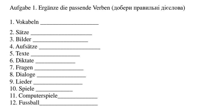 Ответ:Vokabeln - lernen,Sätze - bilden,Bilder - betrachten,Aufsätze - schreiben,Texte - lesen,Diktate - schreiben,Fragen - stellen,Dialoge - führen,Lieder - singen,Spiele - spielen,Computerspiele - spielen,Fußball - spielen.