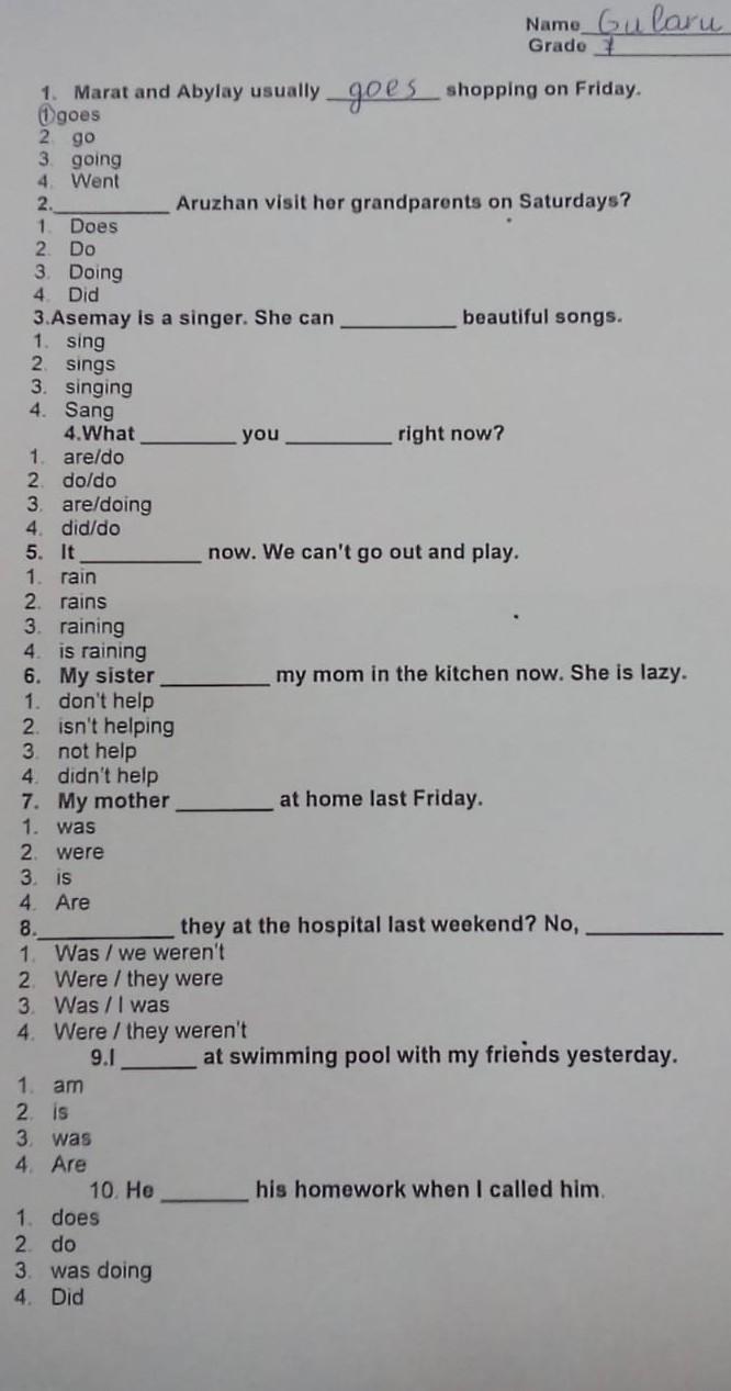 Объяснение:2 does 3sings 4 Are doing 5is raining 6 didn't help7 was 8 were they weren't 9 was 10 was doing