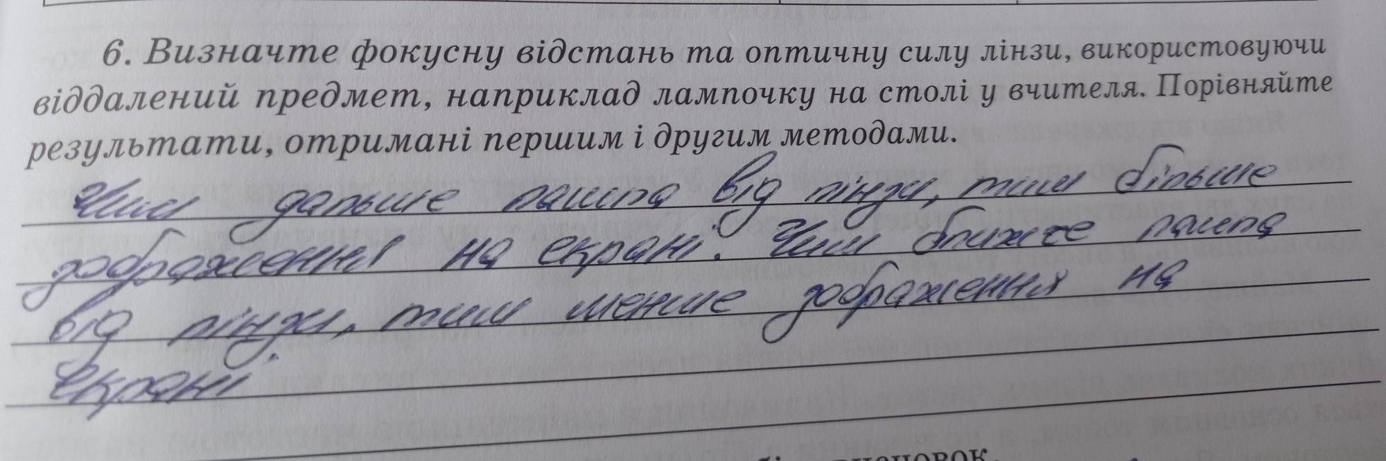 Визначте фокусну відстань та оптичну силу лінзи, використовуючи віддалений предмет, наприклад лампочку на столі у вчителя. Порівняйте результати, отримані першим і другим методами.