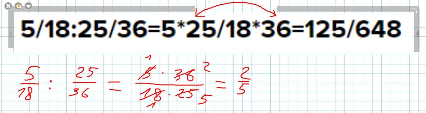 Знайдить помилку в обчисленях 5/18:25/36=5*25/18*36=125/648