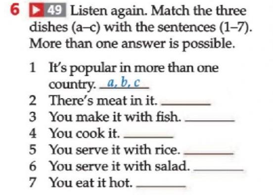 6 ► 49 Listen again. Match the three dishes (a-c) with the sentences (1-7). More than one answer is possible. 1 It's popular in more than one country. a, b, c There's meat in it.. 2 3 You make it with fish.. You cook it.. 4 5 You serve it with rice. 6 You serve it with salad. 7 You eat it hot..