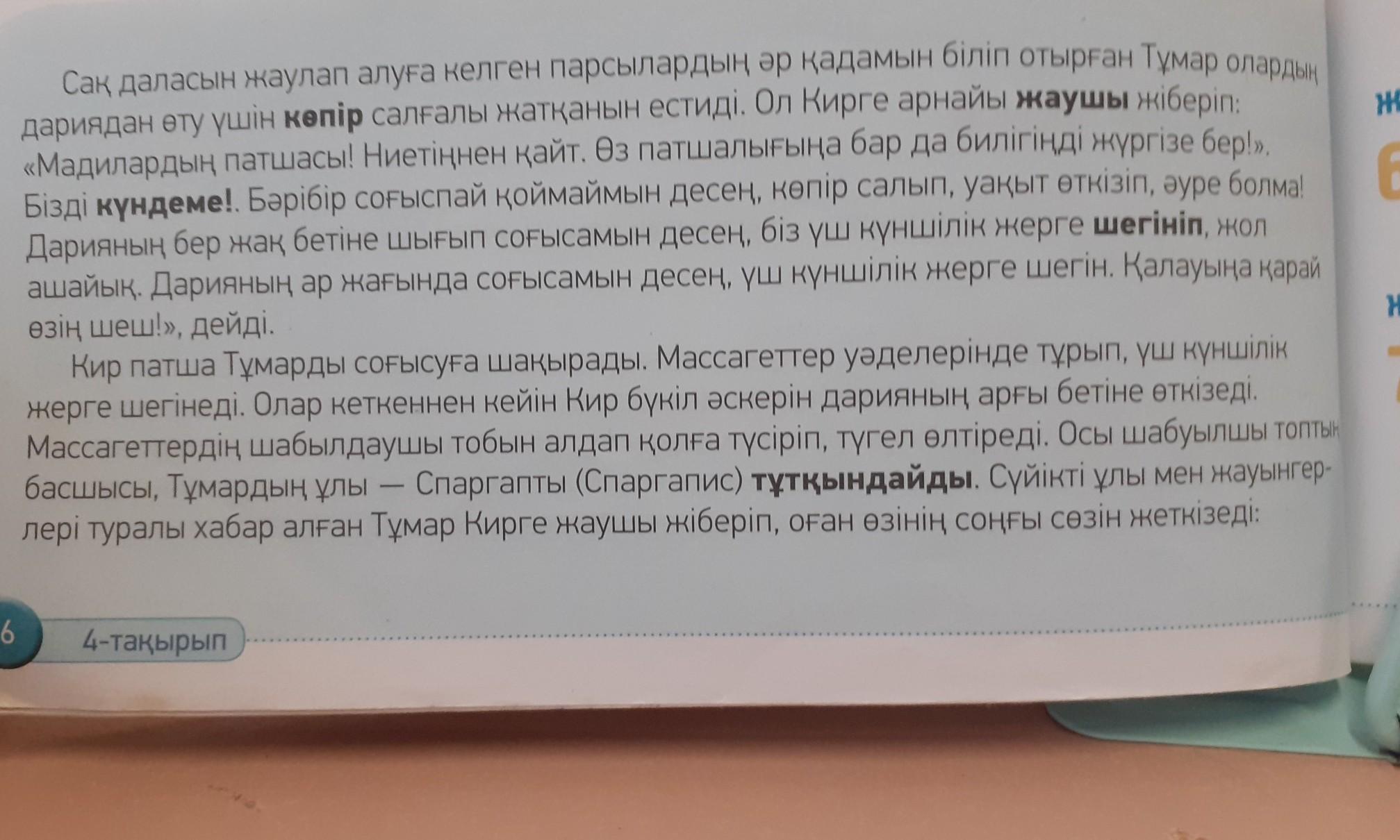 7.Парсылар дарияның бер жағына шығып соғысқысы келсе,Тұмар қандай амал жасаймын деді.