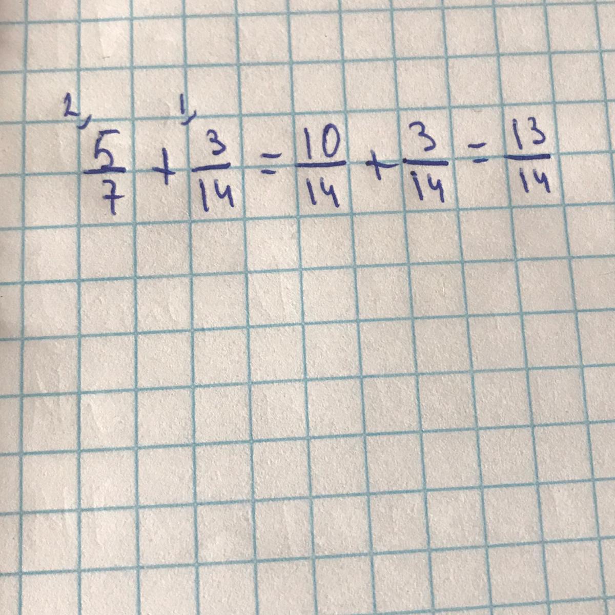 если будут спрашивать как ты решал/а пример то скажи что ты 5 умножил/а на 2 и получила 10 и еще 7 умножил/а на 2 и получил 14 выходит дроб 10/14 затем ты делаешь додавание и получаешь такое пример 10/14 + 3/14 = 13/14