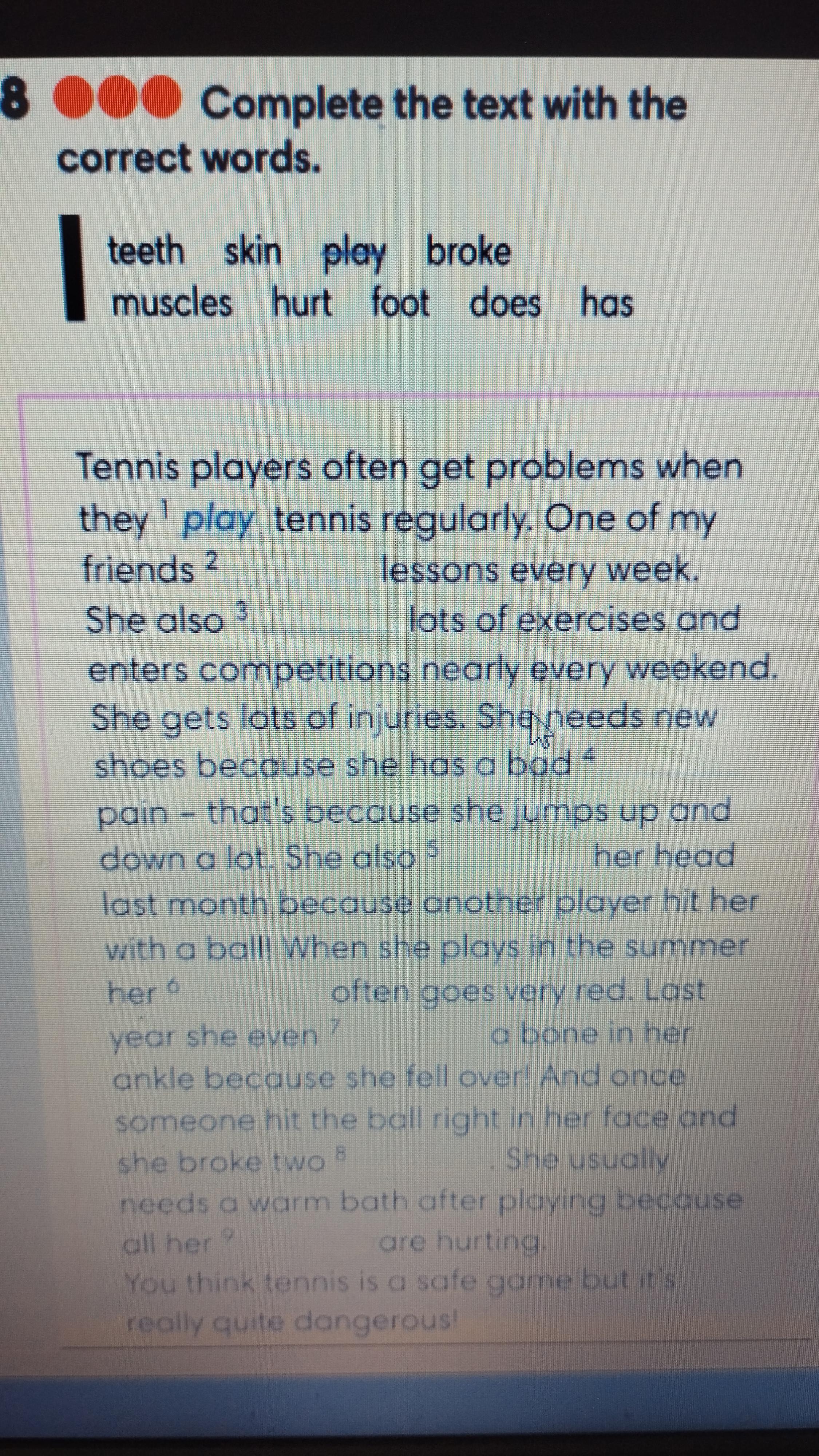 Ответ:Tennis players often get problems when they play tennis regularly. One of my friends has lessons every week. She also does lots of exercises and enters competitions nearly every weekend. She gets lots of injuries. She needs new shoes because she has a bad foot pain – that's because she jumps up and down a lot. She hurt also her head last month because another player hit her with a ball! When she plays in the summer her skin often goes very red. Last year she even broke a bone in her ankle because she fell over! And once someone hit the ball right in her face and she broke two teeth. She usually needs a warm bath after playing because all her muscles are hurting. You think tennis is a safe game but it's really quite dangerous