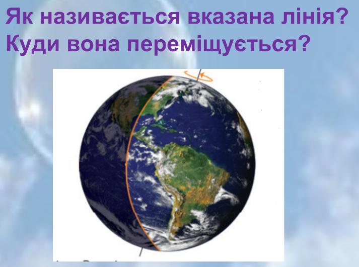 Відповідь: це лінія світла та тіні, вона начебто, як вчили мене, не переміщується, переміщуються континенти, які потрапляють під світло Сонця або ж тіньову зону. А от Земля на малюнку "крутиться" вправо