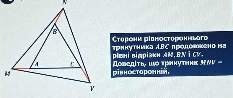 ∆МАN=∆NBV=∆VBM по 2 сторонам и углу между ними, значит МN=NV=MV , следовательно, ∆МNV - равносторонний,что и требовалось доказать.