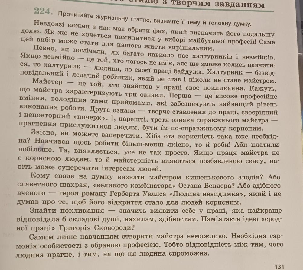 Написати докладний переказ тексту вправи 224. Творче завдання: -придумати заголовок; -визначити стиль тексту; -скласти проСТИЙ ПЛАН. -