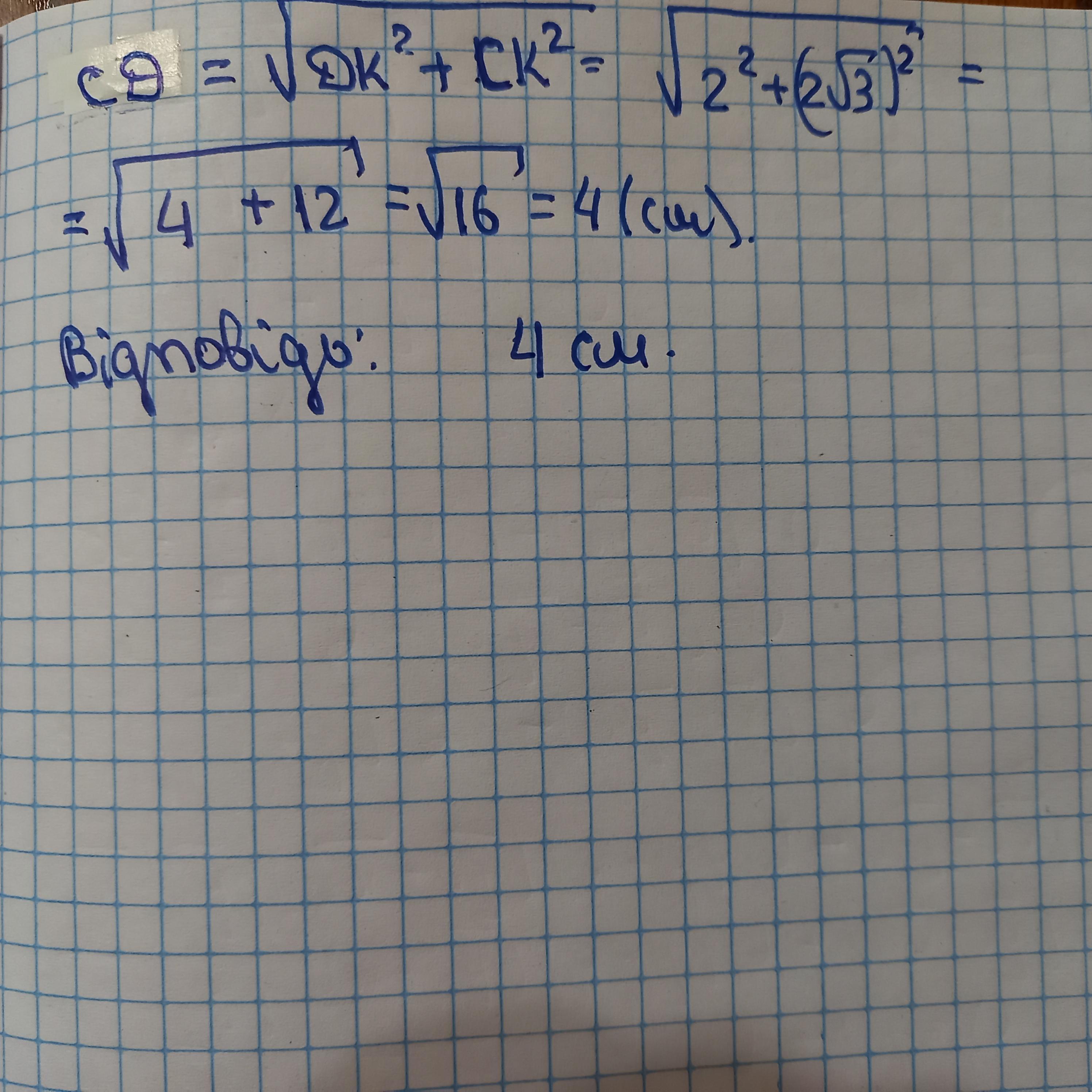 даю 30 балів!!! За неповні, неправильні відповіді чи спам - буду скаржитися! Рівносторонній трикутник АВС та прямокутний рівнобедрений трикутник АВД із прямим кутом Д лежать у перпендикулярних площинах. Знайдіть відстань СД, якщо АВ=4см. з малюнком і поясненням.