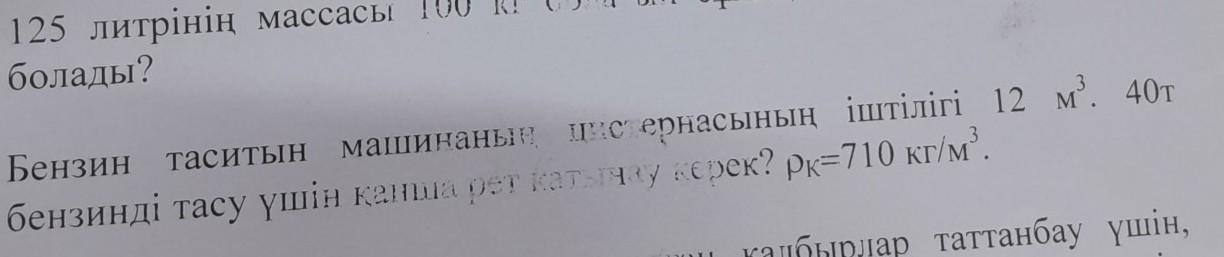бензин таситын машинаның цистерасының іштілігі 12м ³.40т бенхинді тасу үшін қанша рет қатынау керек?рк=710кг/м³