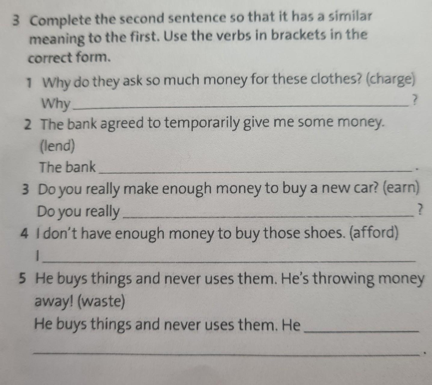 3 Complete the second sentence so that it has a similar meaning to the first. Use the verbs in brackets in the correct form. 1 Why do they ask so much money for these clothes? (charge) Why ? 2 The bank agreed to temporarily give me some money. (lend) The bank 3 Do you really make enough money to buy a new car? (earn) Do you really. ? 4 I don't have enough money to buy those shoes. (afford) 1 5 He buys things and never uses them. He's throwing money away! (waste) He buys things and never uses them. He