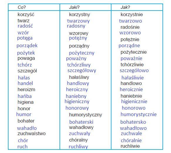 204. Uzupełnij tabelkę wyrazami pokrewnymi. Powiedz, jakie to części mowy.