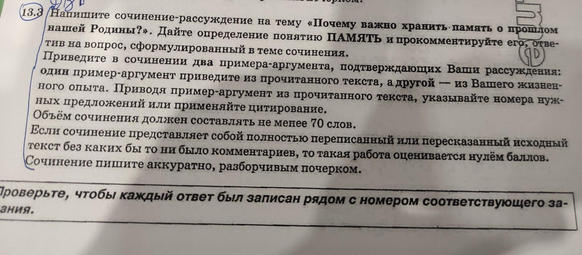 Напишите сочинение-рассуждение на тему «Почему важно хранить память о прошлом нашей Родины?». Дайте определение понятию ПАМЯТЬ и прокомментируйте его, отве тив на вопрос, сформулированный в теме сочинения. Приведите в сочинении (D два примера-аргумента, подтверждающих Ваши рассуждения: один пример-аргумент приведите из прочитанного текста, а другой из Вашего жизнен- ного опыта. Приводя пример-аргумент из прочитанного текста, указывайте номера нуж ных предложений или применяйте цитирование. Объём сочинения должен составлять не менее 70 слов. Если сочинение представляет собой полностью текст без каких бы то ни было комментариев, то такая работа оценивается нулём баллов. Сочинение пишите аккуратно, разборчивым почерком. переписанный или пересказанный исходный