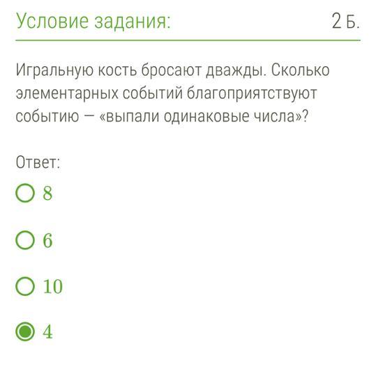 Таким образом, имеем 6 благоприятствующих комбинаций для события "выпали одинаковые числа".