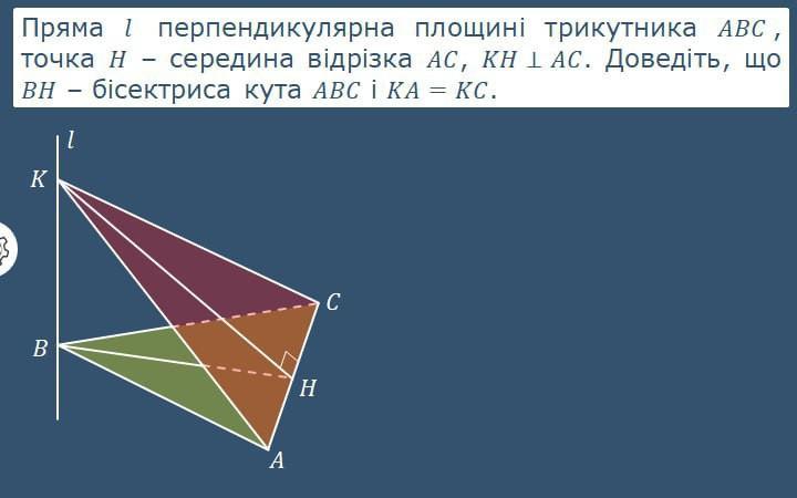 Відомо ,що Н середина АС та КН перпендикулярно АС значить якщо висота є медіаною то цей трикутник рівнобедренний значить і тоді КА=КС,Якщо пряма перепендикулярна площині то вона перпендикулярна і прямим ВС та ВА.Значить ВА та ВС в нас проекції сторін КА та КС в нас вони рівні тоді їх проекції мають теж бути рівними тим паче сторона КВ в цих трикутниках спільна тоді ВА =ВС а значить трикутник теж рівнобедренний а значить медіана ВН буде і біссектриссою
