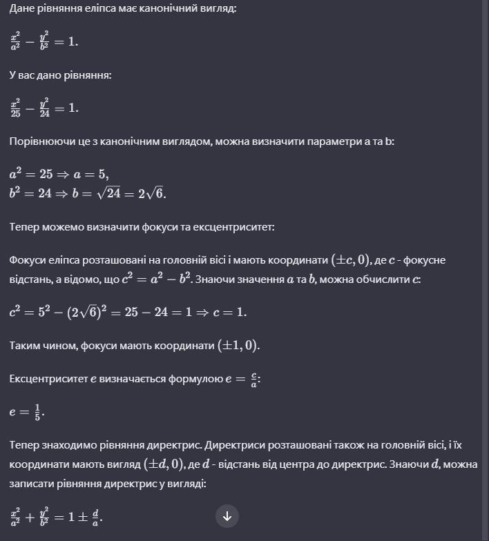 Дано канонічне рівняння еліпса (гіперболи). Визначити координати фокусів, ексцентриситет і рівняння директрис.