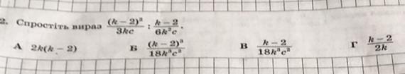 \displaystyle\bf\\\frac{(k-2)^{2} }{3kc} :\frac{k-2}{6k^{2}c } =\frac{(k-2)^{2} }{3kc}\cdot\frac{6k^{2} c}{k-2}=\\\\\\= \frac{(k-2)^{2} }{3kc}\cdot\frac{3k c\cdot 2k}{k-2}= 2k(k-2)\\\\\\Otvet \ : \ A \  \  \ 2k(k-2)