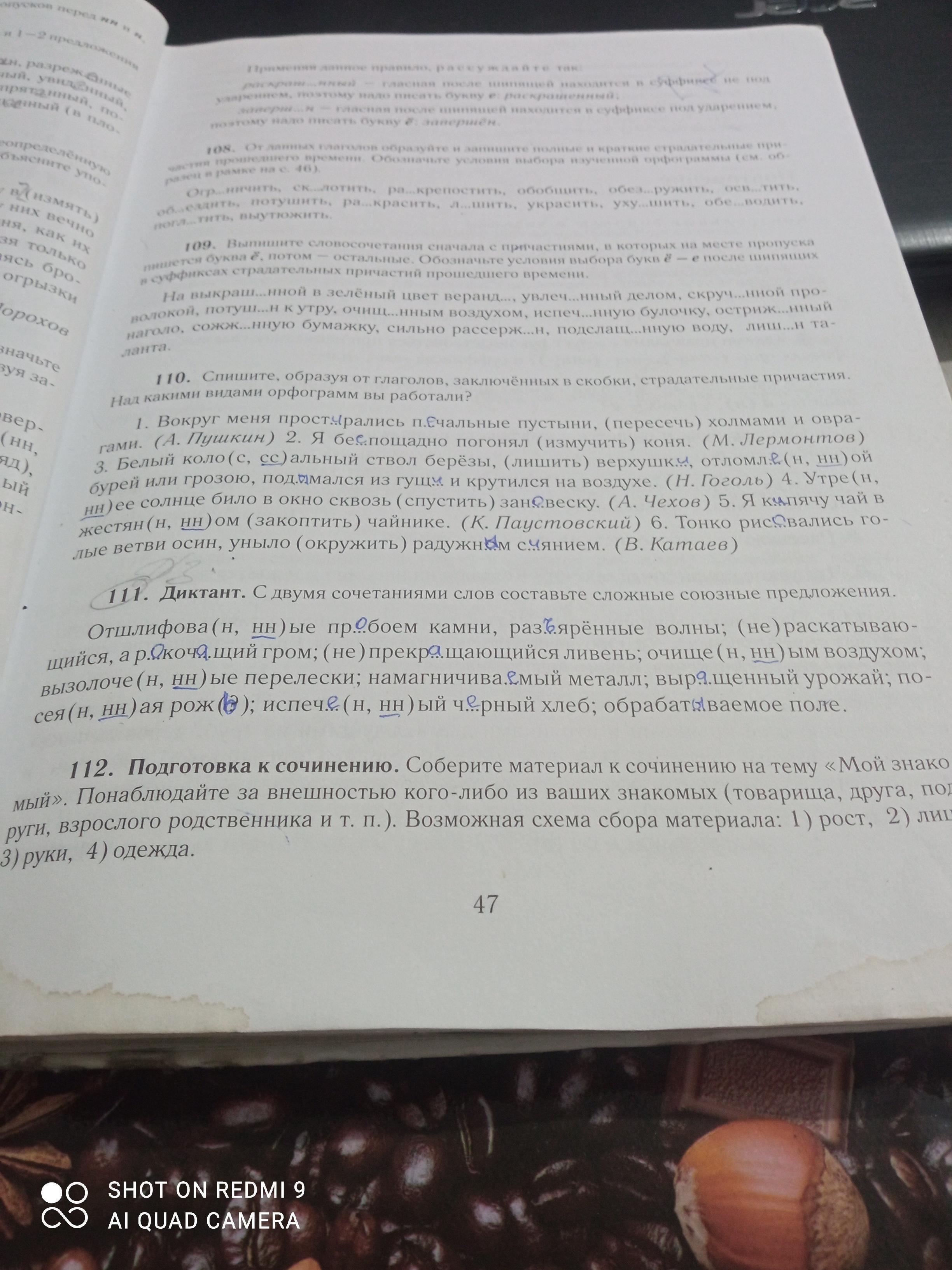 111. Диктант. С двумя сочетаниями слов составьте сложные союзные предложения. Отшлифова(н, нн)ые пр...боем камни, раз...ярённые волны; (не)раскатываю- щийся, а ...ко...щий гром; (не)прекр..щающийся ливень; очище (н, нн)ым воздухом; вызолоче (н, нн)ые перелески; намагничива...мый металл; выр...щенный урожай; по- сея(н, нн)ая рож(?); испеч..(н, нн)ый ч..рный хлеб; обрабат...ваемое поле.