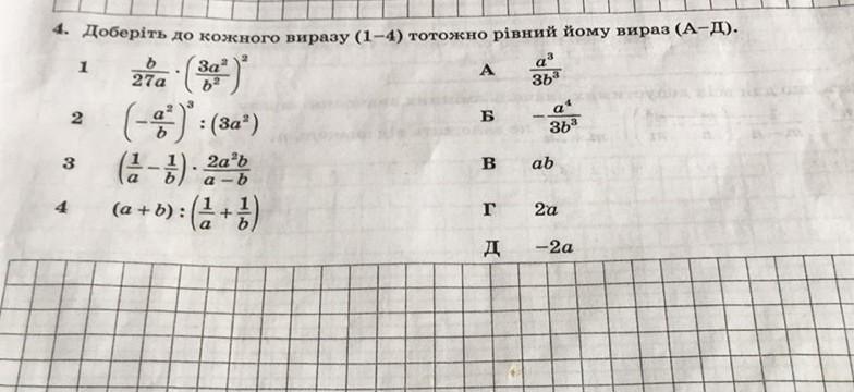 4. Доберіть до кожного виразу (1-4) тотожно рiвний йому вираз (А-Д). ,будьласка швидше дам 15 балів!!!