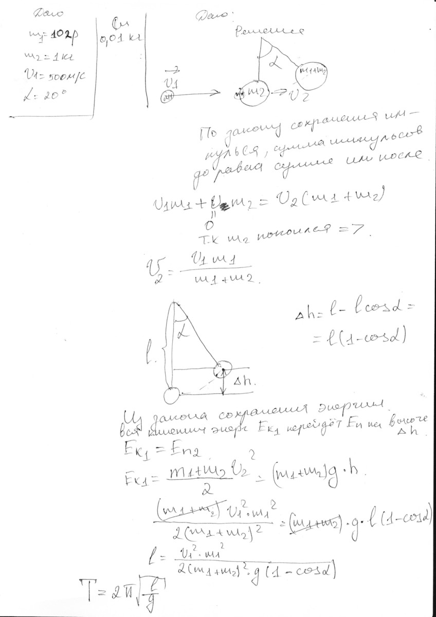 Тело массой 10 г, движущееся горизонтально со скоростью 500 м/с, попала в подвешенный на невесомой нити шар, массой 1 кг и застрял в нем. Нить при этом отклонилась на угол 20 градусов от вертикали. Определите период колебаний шара.