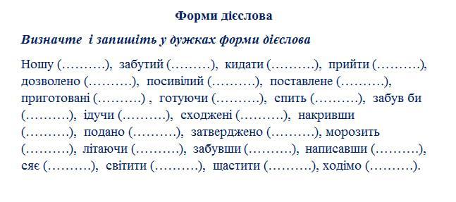 Ношу (особове дієслово), забутий (дієприкметник), кидати (неозначена форма (інфінітив)), прийти (неозначена форма (інфінітив)), дозволено (безособове дієслово), посивілий (дієприкметник), поставлене (дієприкметник), приготовані (дієприкметник), готуючи (дієприслівник), спить (особове дієслово), забув би (особове дієслово), ідучи (дієприслівник), сходжені (дієприкметник), накривши (дієприслівник), подано (безособове дієслово), затверджено (безособове дієслово), морозить (безособове дієслово), літаючи (дієприслівник), забувши (дієприслівник), написавши (дієприслівник), сяє (особове дієслово), світити (неозначена форма (інфінітив)), щастити (неозначена форма (інфінітив)), ходімо (особове дієслово).