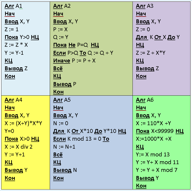 Все переменные - целочисленные. Операция mod - остаток от деления, div - целочисленное деление.Поставьте в соответствие имена алгоритмов и выводимые ими результаты при X=3, Y=5.