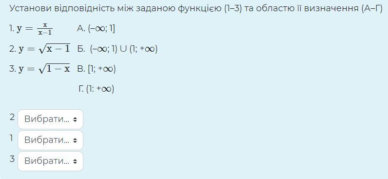 Допоможіть будь ласка! Установи відповідність між заданою функцією (1–3) та областю її визначення (А–Г)