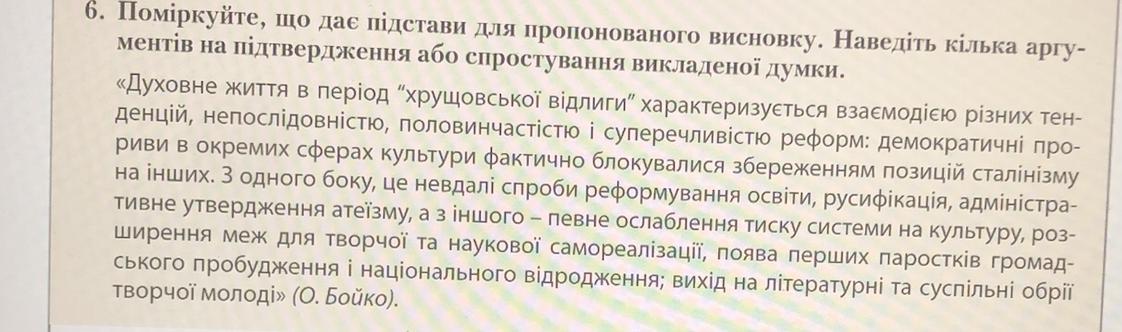 Аргумент на користь цього висновку можна знайти у невдалих спробах реформування освіти та адміністративному утвердженні атеїзму. Це свідчить про опозицію консервативних сил утриманням сталіністських ідей. З іншого боку, ослаблення тиску системи на культуру створювало певні умови для творчості та наукової самореалізації, що може служити додатковим аргументом.