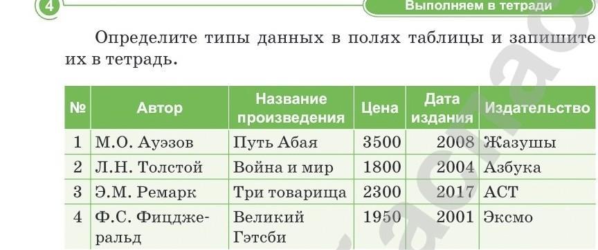 Определите типы данных в полях таблицы и запишите их в тетрадь. Автор 1 М.О. АуэзОВ 2 Л.Н. Толстой 4 3 Э.М. Ремарк Ф.С. Фицдже- ральд No Название произведения Цена Путь Абая 3500 Война и мир 1800 Три товарища 2300 1950 Великий Гэтсби Дата издания Издательство 2008 Жазушы 2004 Азбука 2017 ACT 2001 Эксмолшшщщщщщщщщщщщщщщщщ