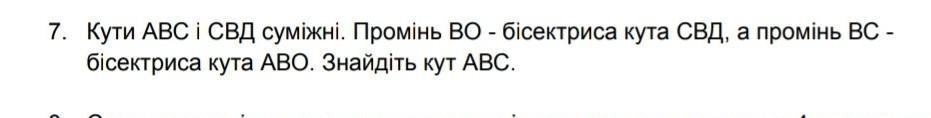 Кути АВС і СВД суміжні. Промінь ВО бісектриса кута СВД, а промінь ВС - бісектриса кута АВО. Знайдіть кут АВС