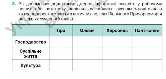 3. За допомогою додаткових джерел інформації складіть у робочому зошитi або нотатнику порівняльну таблицю суспільно-політичного та господарського життя в античних полісах Північного Причорномор'я на землях сучасної України.