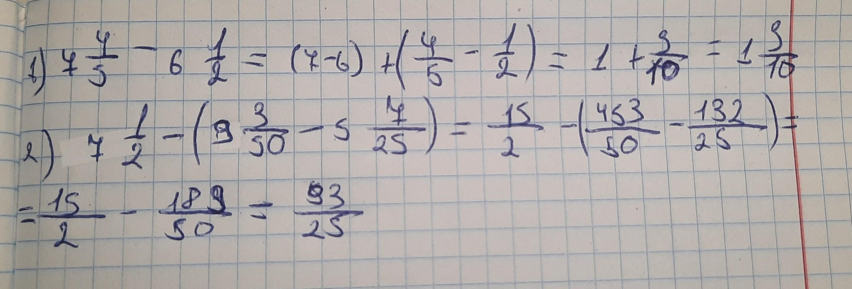 7 4/5 - 6 1/2 => НОК(5;2)=10 => 7 8/10 - 6 5/10 = 1 3/10 = 1.3.