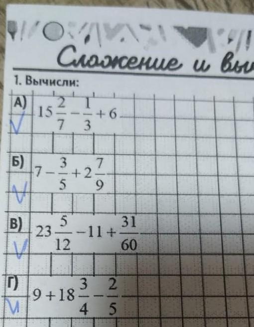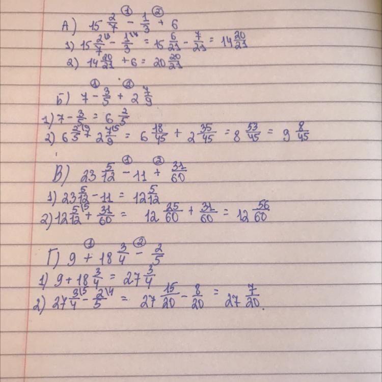1. Вычисли: A) B) Г) 15 M 2 7 Б) 3 7 7 +2. 9 23 —— 1 5 5 - 12 3 +6 -11+ 9+18- 3 2 4 5 31 60