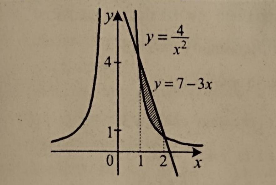 S=∫(1;2)(7-3x)dx - ∫(1;2)(4/x^2)dx = 5/2-2 = 1/2 кв.ед.