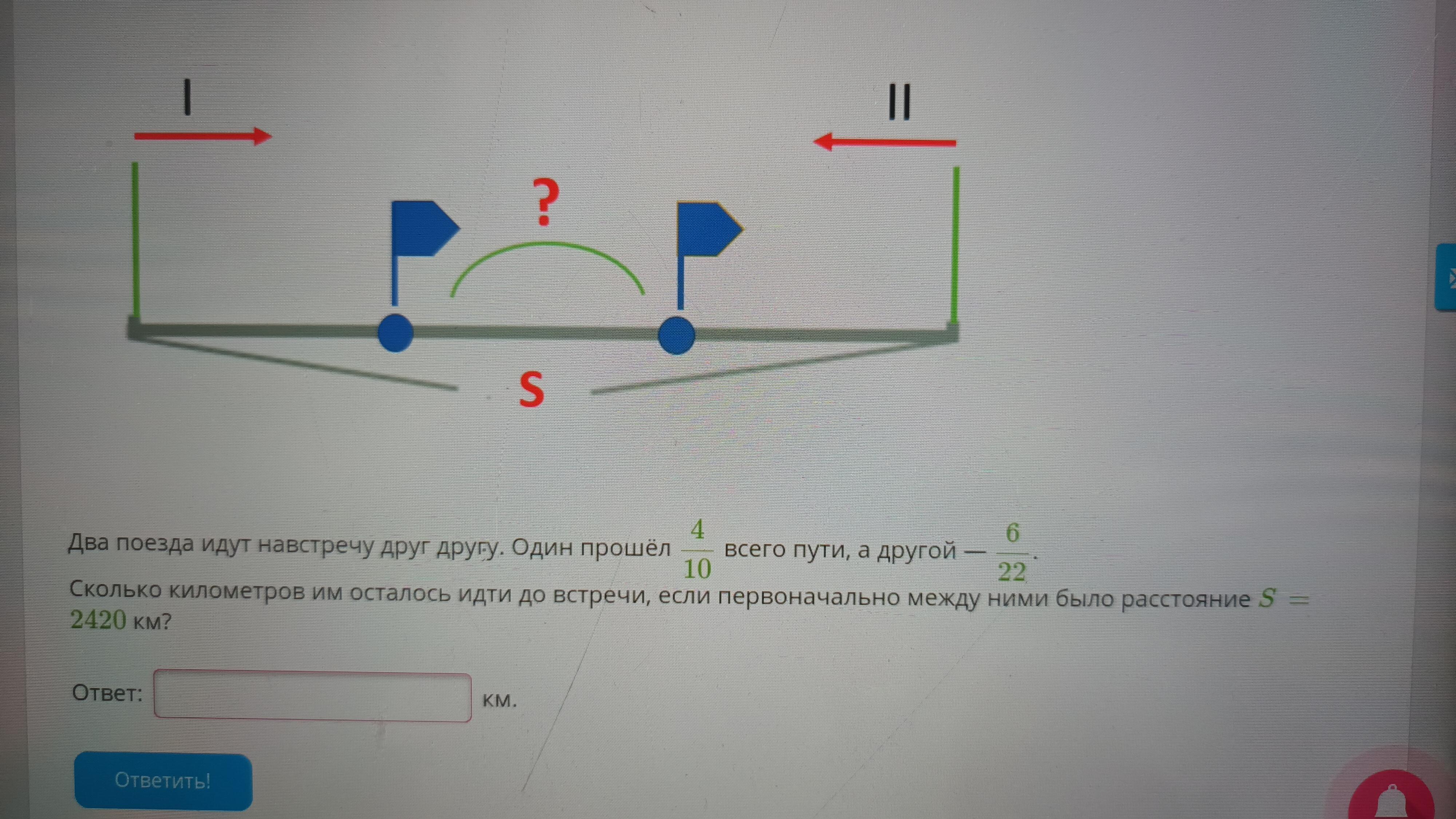 Два поезда идут на встречу друг другу. Один прошел 4/10 всего пути, а другой 6/22. Сколько километров им осталось идти до встречи, если первоначально между ними была расстояние S = 2420 км?