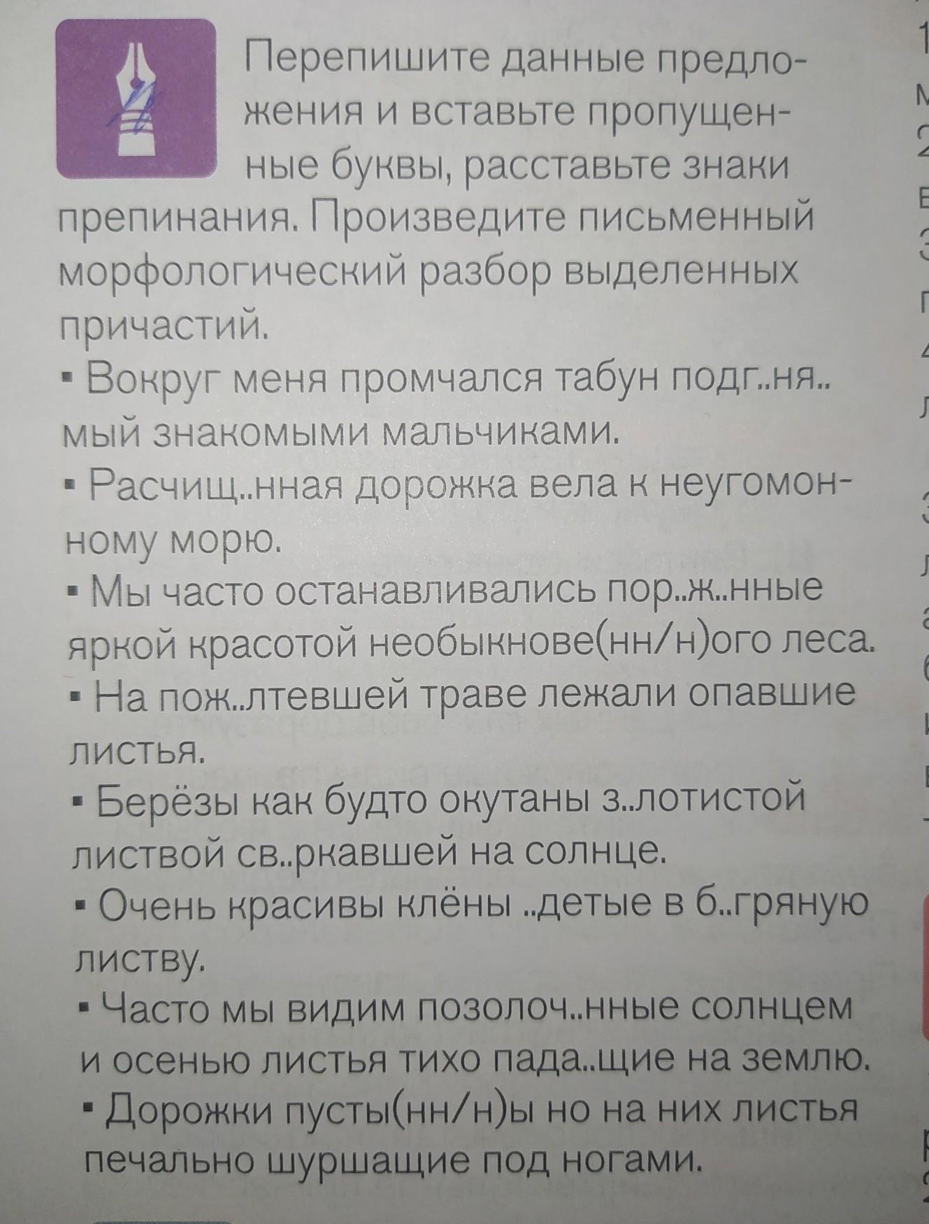 Перепишите данные предло- жения и вставьте пропущен- ные буквы, расставьте знаки препинания. Произведите письменный морфологический разбор выделенных причастий. • Вокруг меня промчался табун подг..ня..мый знакомыми мальчиками. • Расчищенная дорожка вела к неугомонному морю.