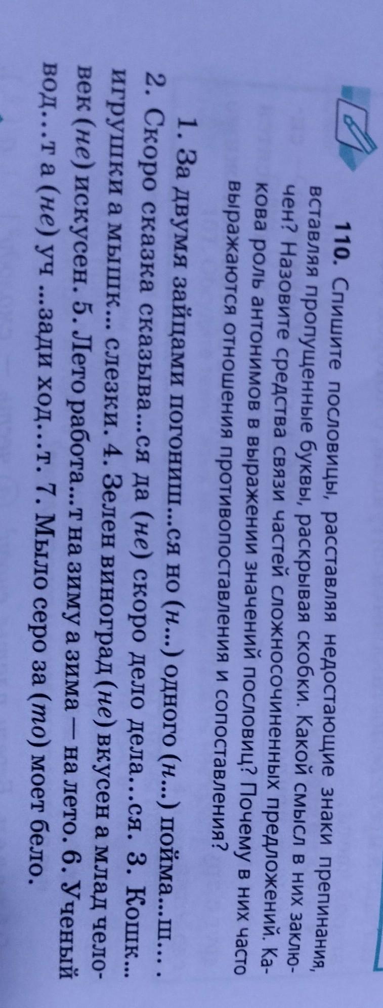 110. Спишите пословицы, расставляя недостающие знаки препинания вставляя пропущенные буквы, раскрывая скобки. Какой смысл в них заклю- чен? Назовите средства связи частей сложносочиненных предложений. Ка- кова роль антонимов в выражении значений пословиц? Почему в них часто выражаются отношения противопоставления и сопоставления?