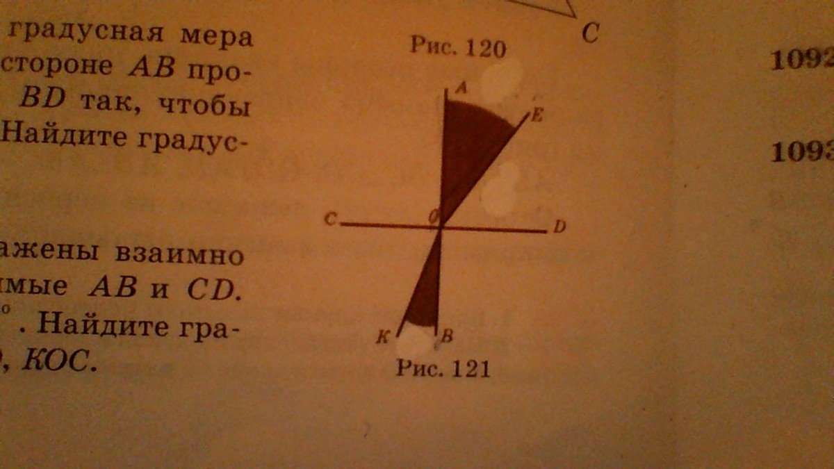 На рисунке изображены взаимно перпендикулярные прямые AB и CD. Угол AOE равен 35 градусов угол KOB равен 20 градусов.Найдите градусную меру углов EOD, KOC