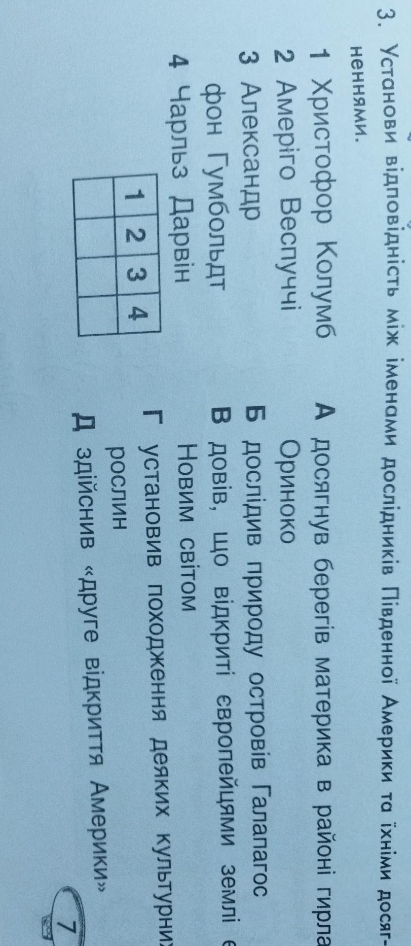 Установи відповiднiсть мiж іменами дослідників Південної Америки та їхніми досяг- неннями. 1 Христофор Колумб А досягнув берегів материка в районі гирла 2 Амерiго Веспуччі Ориноко 3 Александр фон Гумбольдт 4 Чарльз Дарвін 1234 Б дослідив природу островів Галапагос в довів, що відкриті європейцями землі є Новим світом Г установив походження деяких культурних рослин Д здійснив «друге відкриття Америки