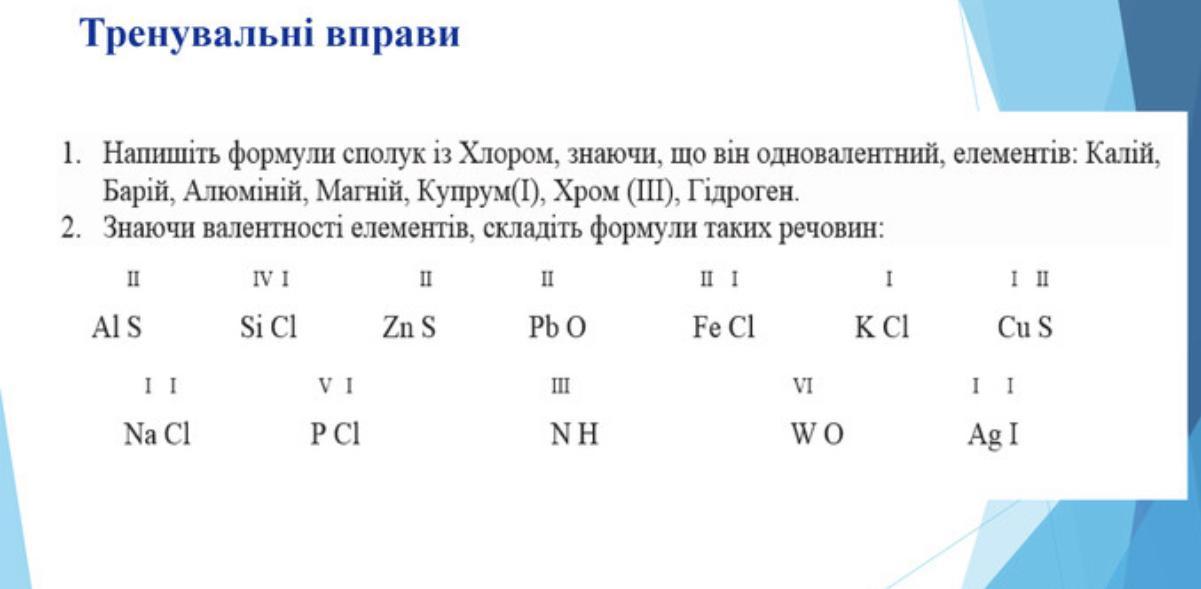 2. Знаючи валентності елементів, складіть формули таких речовин: