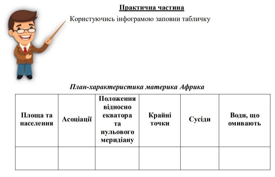 площа 29,2 млн км² населення 1,216 мільярда асоціації пустелі положення відносно екватору перетинає навпіл крайні точки північна мис Рас-Енгела південна мис Агульяс західна мис Альмаді східна мис Рас-Хафун сусіди На північному заході Африка відділена Гібралтарською протокою від Європи, на північному сході — Суецьким каналом і Баб-ель-Мандебською протокою від Азії води що омивають на півночі Африка омивається Середземним морем, на заході безпосередньо Атлантичним океаном, на сході — Червоним морем та безпосередньо Індійським океаном.