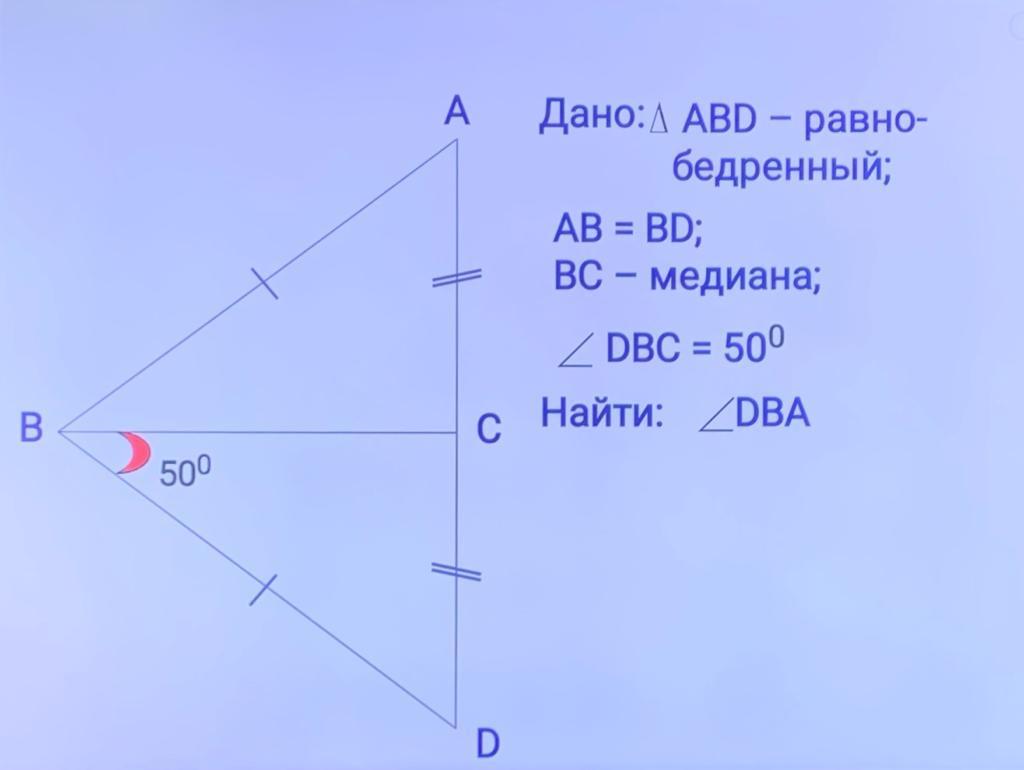 1. Так как ВС медиана, проведённая к основанию, то она ещё является и биссектрисой=> <DBC=<CBA=50°=> <DBA=<DBC+<CBA=100°.