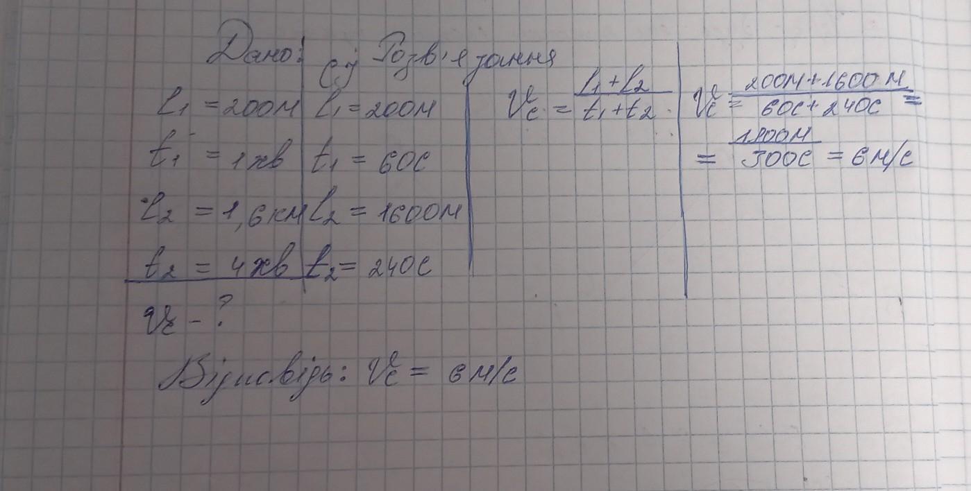За першу хвилину велосипедист проїхав 200 м, а за наступні 4 хвилини - 1,6 км. Чому доівнює середня швидкість руху велосипедиста ?