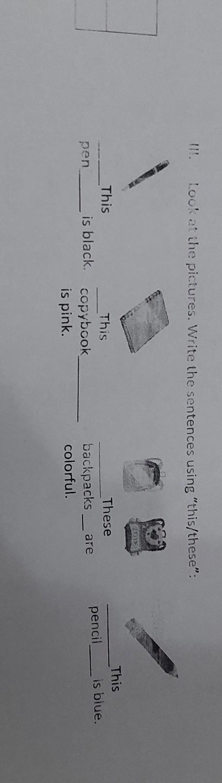 Look at the pictures. Write the sentences using "this/these": This This pen__________ is black. copybook_ is pink. 2 Tiv These backpacks are colorful. This pencil________ is blue.