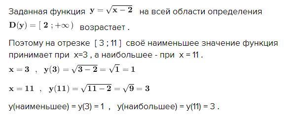Поэтому на отрезке [ 3 ; 11 ] своё наименьшее значение функция принимает при х=3 , а наибольшее - при х = 11 .