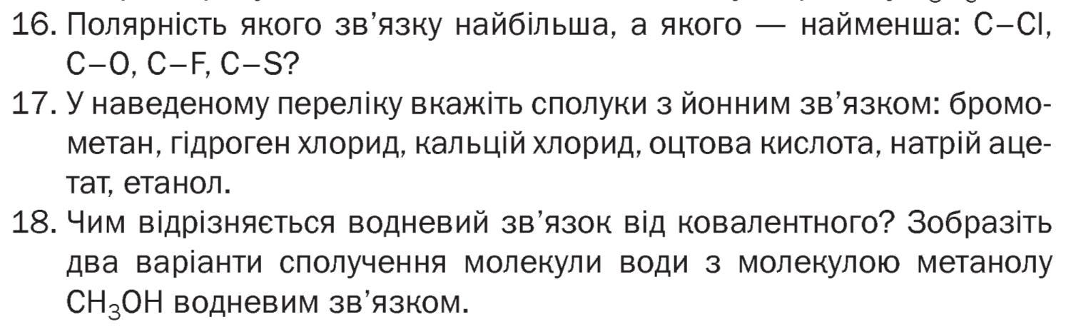 Вправа 16. Полярність якого зв'язку найбільша, а якого - найменша: С- CI, C-O, C-F, C-Ѕ?
