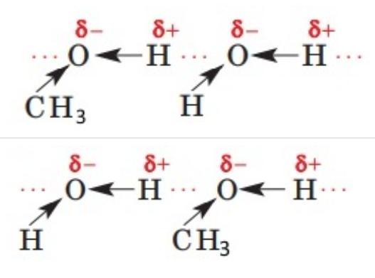 Зобразіть два варіанти сполучення молекули води з молекулою метанолу СН3ОН водневим зв'язком.(на фото)