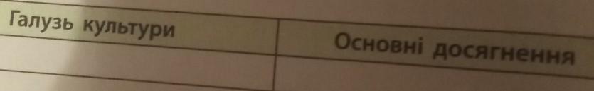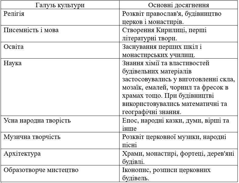 Галузі культури( 1 колонка): релігія, писемність і мова, освіта, наука, усна народна творчість, музична творчість, архітектура, образотворче мистецтво